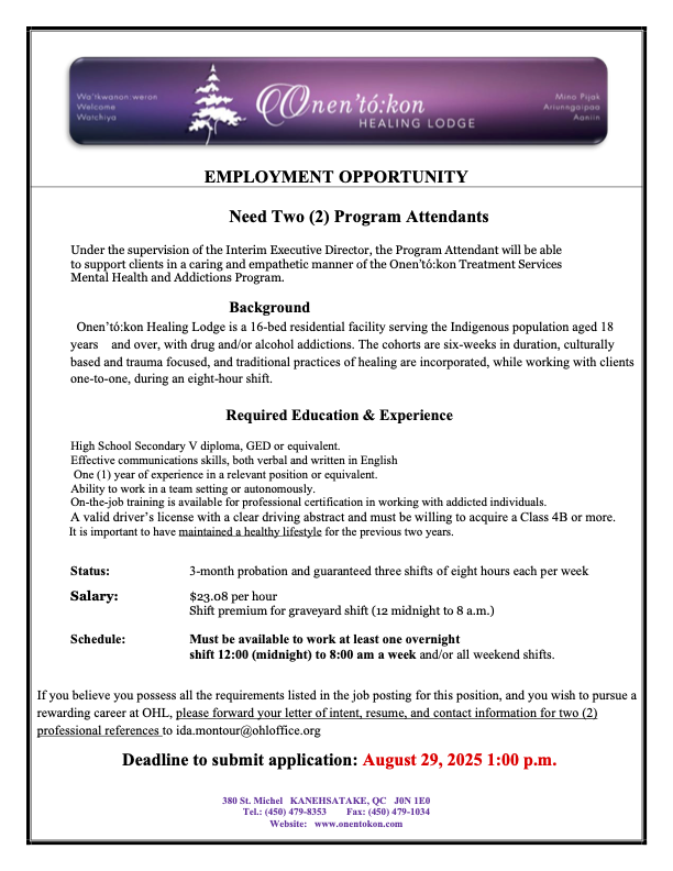 The Onen’tó:kon Healing Lodge has 2 positions open for Program Attendants. The Deadline to apply is August 29th, 2025 1:00PM. For more information please click on the link below or see the attached poster.